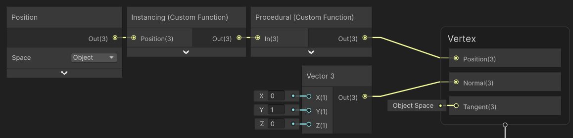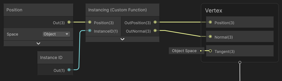 ), that mostly required the GPU Instancing tickbox to be enabled on the material (though per-instance properties needed more setup). But that is limited to 1023 instances (due to using arrays) and uploads matrices every frame, so that function is somewhat inefficient compared to the others. - For the functions listed in the intro above, they will try to use the “procedural instancing path” if the shader supports it. By default Shader Graph doesn’t include support, but we can add it using a couple Custom Function nodes (as shown in breakdown below in tabs prior to Unity 6)